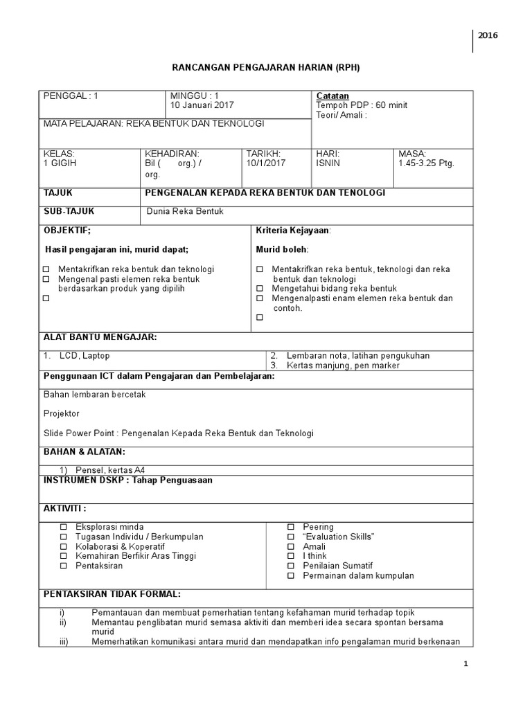 . Reka Bentuk Teknologi Gradelevel. 2016 RANCANGAN PENGAJARAN HARIAN RPH PENGGAL. RPT Sejarah Tingkatan 1 Zon A.